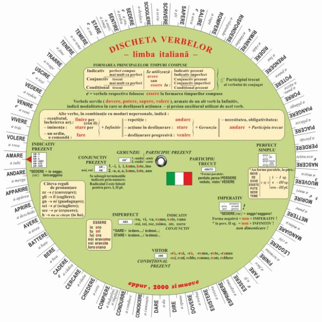 Verbe sistematizate si prezentate prin intermediul unui disc rotitor: • 52 de verbe esentiale, frecvent utilizate, cu particularitati de conjugare, dar si verbe-model; in casete este notata formarea timpurilor compuse sau a unor uzuale constructii perifrastice. In ferestrele discului pot fi citite: • forme din conjugarea verbelor alese sau radicali la care se adauga seriile de terminatii specifice, prezentate alaturat. Pe verso: • alte 280 de verbe uzuale, cu indicarea modelelor de conjugare urmate de acestea si cu precizarea unor eventuale abateri. Mod de utilizare: • reperul de citire de pe disc se fixeaza in dreptul unui verb selectat, iar in ferestrele discului pot fi citite formele verbului ales, eventual adaugandu-se terminatiile specifice.