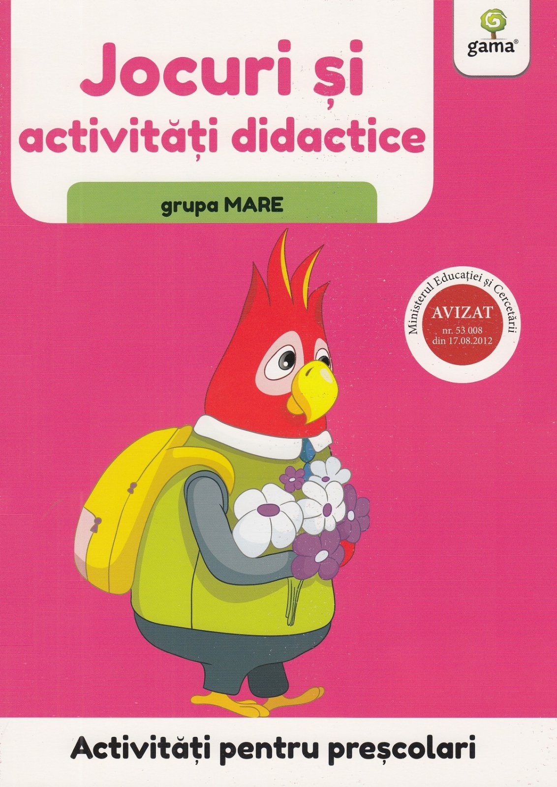 Colecția de caiete de lucru Activități pentru preșcolari se adresează deopotrivă părinților și educatorilor, care le pot folosi drept material de lucru cu copiii. Pentru fiecare segment de vârstă – 3-5 ani (grupele mică și mijlocie) și 5-6/7 ani (grupa mare) – există câte patru caiete tematice, potrivite diferitelor domenii de studiu: Activități matematice corespunde domeniului științelor; Educarea limbajului corespunde domeniului lingvistic și literar; Cunoașterea mediului corespunde atât domeniului științelor, cât și celui socio-uman; Jocuri și activități didactice corespunde domeniului estetic și creativ, dar urmărește și consolidarea tuturor noțiunilor învățate. Avantajul acestor caiete este faptul că pe fiecare pagină există sarcini multiple, care îi oferă copilului prilejul să-și exerseze diverse cunoștințe și abilități. Caietul de lucru Jocuri și activități didactice • grupa mare urmărește mai multe scopuri didactice: formarea deprinderii de a desena; exersarea coordonării mână-ochi; identificarea traseului corect printr-un labirint; unirea punctelor în ordine crescătoare, numărând până la 10; identificarea diferențelor dintre imagini; exersarea semnelor grafice. Sfaturi pentru părinți: cereți-i să observe culorile, textura și forma lucrurilor din jur; ascultați împreună muzică pentru copii specifică diverselor culturi; lăsați-i mereu la îndemână creioane, acuarele și foi pentru desen; explorați diverse suprafețe de lucru și instrumente pentru aplicarea culorii; încurajați-l să amestece culorile și să observe cum se combină; înrămați-i și expuneți-i desenele, pentru a-i spori încrederea în sine; observați-i și lăudați-i întotdeauna progresele!