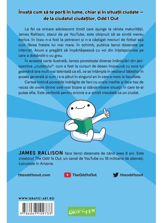 Cum să fii grozav și alte lucruri pe care clar le-am învățat maturizându-mă Învaţă cum să te porți în lume, chiar şi în situații ciudate - de la ciudatul ciudaților, Odd 1 Out La fel ca oricare adolescent timid care ajunge la vârsta maturității, James Rallison, starul de pe YouTube, este obişnuit să se simtă mereu exclus. În liceu n-a fost la petreceri şi n-a câştigat meciuri de fotbal aşa cum făcea fratele lui mai mare.În schimb, publica benzi desenate pe internet. Acum e pregătit să împărtăşească cu voi din înţelepciunea pe care a dobândit-o cu greu. În această carte ilustrată, James povesteşte diverse întâmplări din perspectiva „ciudatului": cum a fost la cursuri de desen împreună cu sora lui geamănă (era mult mai talentată ca el), ce se întâmpla în vestiarul băieţilor in școala generală şi cum i s-a părut în singurul an în care a mers la facultate. Cartea îmbină poveştile indrăgite de fani cu unele inedite şi face haz de necaz de unele dintre cele mai bizare şi stânjenitoare situații în care te-ai putea afla. Este perfectă pentru oricine s-a simțit vreodată ca un ciudat.