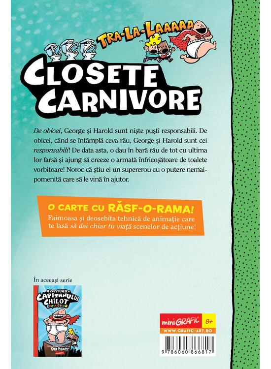 Al doilea roman grozav scris de Dav Pilkey De obicei, George şi Harold sunt nişte puşti responsabili. De obicei, când se întâmplă ceva rău, George şi Harold sunt cei responsabili! De data asta, o dau în bară rău de tot cu ultima lor farsă şi ajung să creeze o armată înfricoşătoare de toalete vorbitoare! Noroc că ştiu ei un supererou cu o putere nemaipomenită care să le vină în ajutor. O CARTE CU RĂSF-O-RAMA! Faimoasa şi deosebita tehnică de animație care te lasă să dai chiar tu viață scenelor de acțiune!