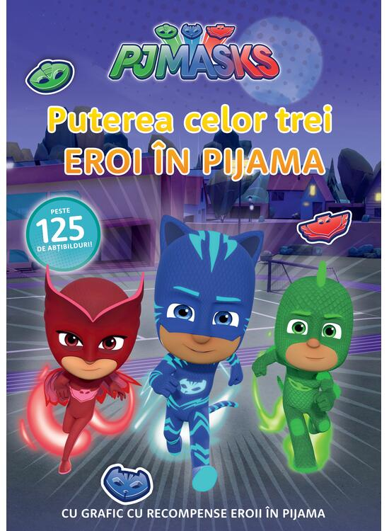 Seria Eroi în Pijama E vremea să devenim eroi! În timpul zilei sunt Connor, Greg și Amaya, dar noaptea devin Pisoi, Șopi și Bufniță - Eroii în Pijama! Colorează, lipește și joacă-te cu această carte interactivă cu abțibilduri despre eroii noștri favoriți! Eroi în Pijama, Eroi în Pijama! În noapte ne-avântăm, ziua o salvăm!