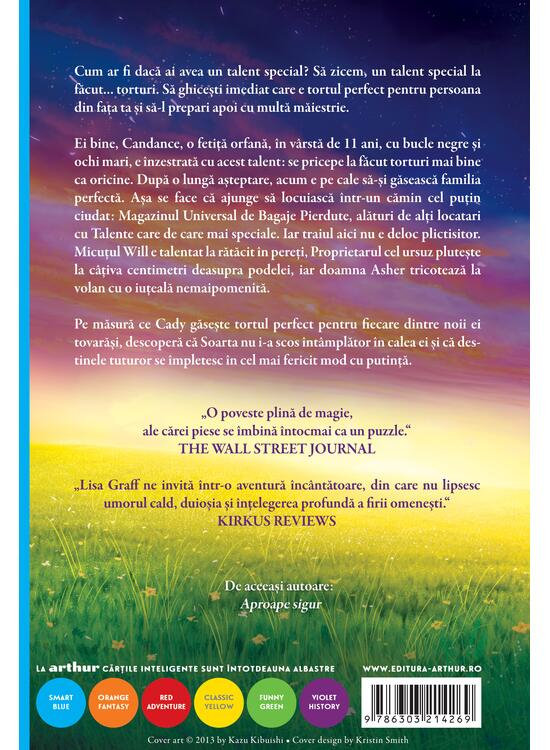 Ei bine, Candance, o fetiță orfană, în vârstă de 11 ani, cu bucle negre și ochi mari, e înzestrată cu acest talent: se pricepe la făcut torturi mai bine ca oricine. După o lungă așteptare, acum e pe cale să-și găsească familia perfectă. Așa se face că ajunge să locuiască într-un cămin cel puțin ciudat: Magazinul Universal de Bagaje Pierdute, alături de alți locatari cu Talente care de care mai speciale. Iar traiul aici nu e deloc plictisitor. Micuțul Will e talentat la rătăcit în pereți, Proprietarul cel ursuz plutește la câțiva centimetri deasupra podelei, iar doamna Asher tricotează la volan cu o iuțeală nemaipomenită.