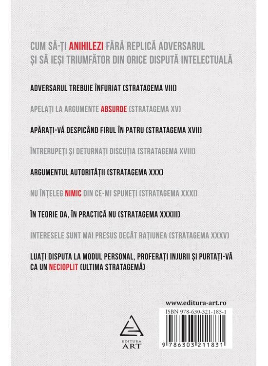 Cum să-ți anihilezi fără replică adversarul și să ieși triumfător din orice dispută intelectuală. O carte despre disputa de argumente care te va ajuta să identifici strategiile la care recurg cei ce vor să aibă întotdeauna dreptate. Adversarul trebuie înfuriat (Stratagema VIII) Apelați la argumente absurde (Stratagema XV) Apărați-vă despicând firul în patru (Stratagema XVII) Întrerupeți și deturnați discuția (Stratagema XVIII) Argumentul autorității (Stratagema XXX) Nu înțeleg nimic din ce-mi spuneți (Stratagema XXXI) În teorie da, în practică nu (Stratagema XXXIII) Interesele sunt mai presus decât rațiunea (Stratagema XXXV) Luați disputa la modul personal, proferați injurii și purtați-vă ca un necioplit (ultima Stratagemă)