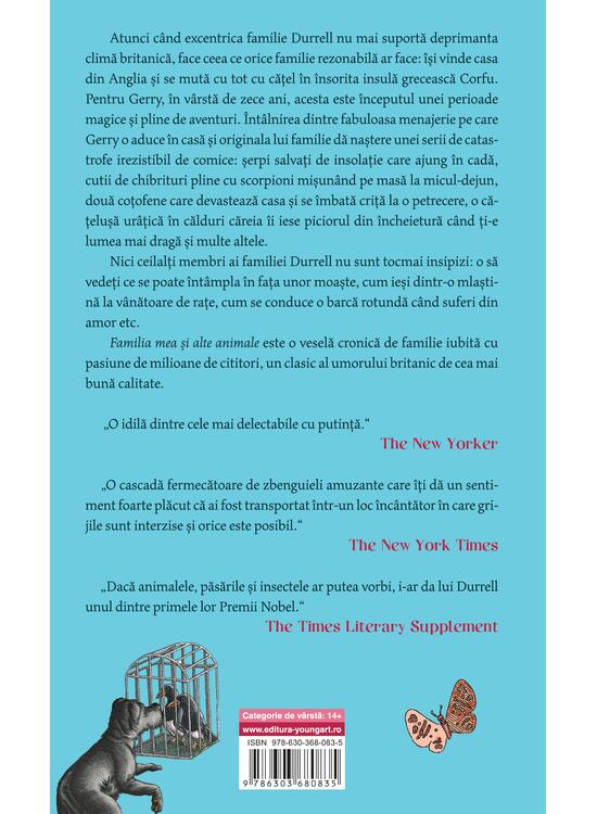 Nici ceilalți membri ai familiei Durrell nu sunt tocmai insipizi: o să vedeți ce se poate întâmpla în fața unor moaște sfinte, cum ieși dintr-o mlaștină la vânătoare de rațe, cum se conduce o barcă rotundă când suferi din amor etc. Familia mea și alte animale este o veselă cronică de familie, iubită cu pasiune de milioane de cititori, un clasic al umorului britanic de cea mai bună calitate. Încetul cu încetul, vraja insulei s-a pogorât asupra noastră tot atât de domol şi aderent ca polenul.