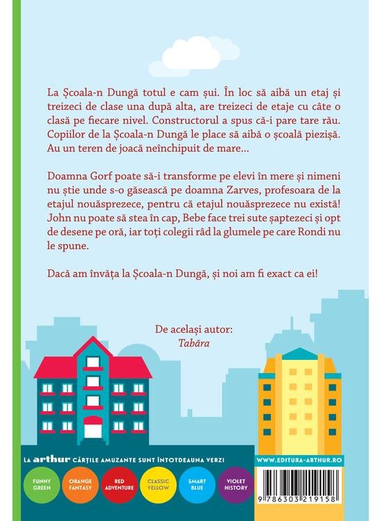 La Școala-n Dungă totul e cam șui. În loc să aibă un etaj și treizeci de clase una după alta, are treizeci de etaje cu câte o clasă pe fiecare nivel. Constructorul a spus că-i pare rău. Copiilor de la Școala-n Dungă le place să aibă o școală piezișă. Au un teren de joacă neînchipuit de mare... Doamna Gorf poate să-i transforme pe elevi în mere și nimeni nu știe unde să o găsească pe doamna Zarves, profesoara de la etajul nouăsprezece, pentru că etajul nouăsprezece nu există! John nu poate să stea în cap, Bebe face trei sute șaptezeci și opt de desene pe oră, iar toți colegii râd la glumele pe care Rondi nu le spune. Dacă am învăța la Școala-n Dungă, și noi am fi exact ca ei!